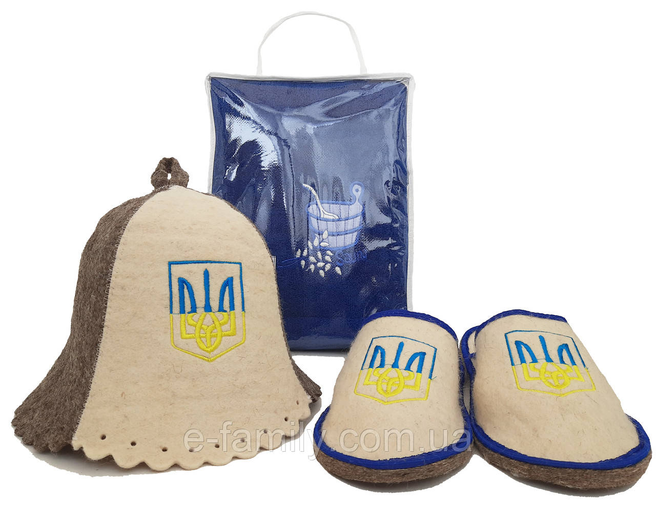 Набір для лазні та сауни чоловічий Тризуб (Парео синє, Шапочка, Тапочки 43-44) в упаковке